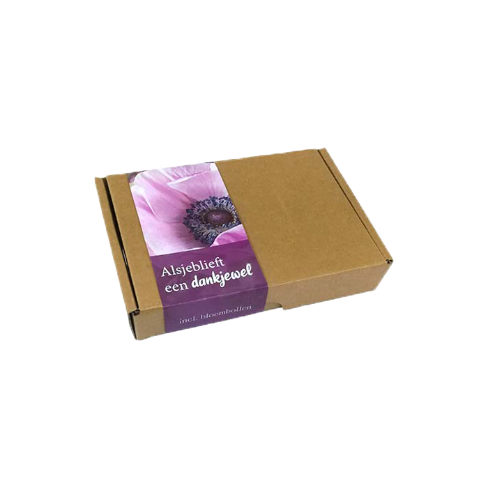 Het kraftdoosje is gevuld met Anemonen de Caen en is zeer gemakkelijk te versturen met de post. Anemonen de Caen zijn mooie bloemetjes die garant staan voor een gezellige en stevige bloei! Anemonen kunnen zowel in het voorjaar als in het najaar geplant worden.